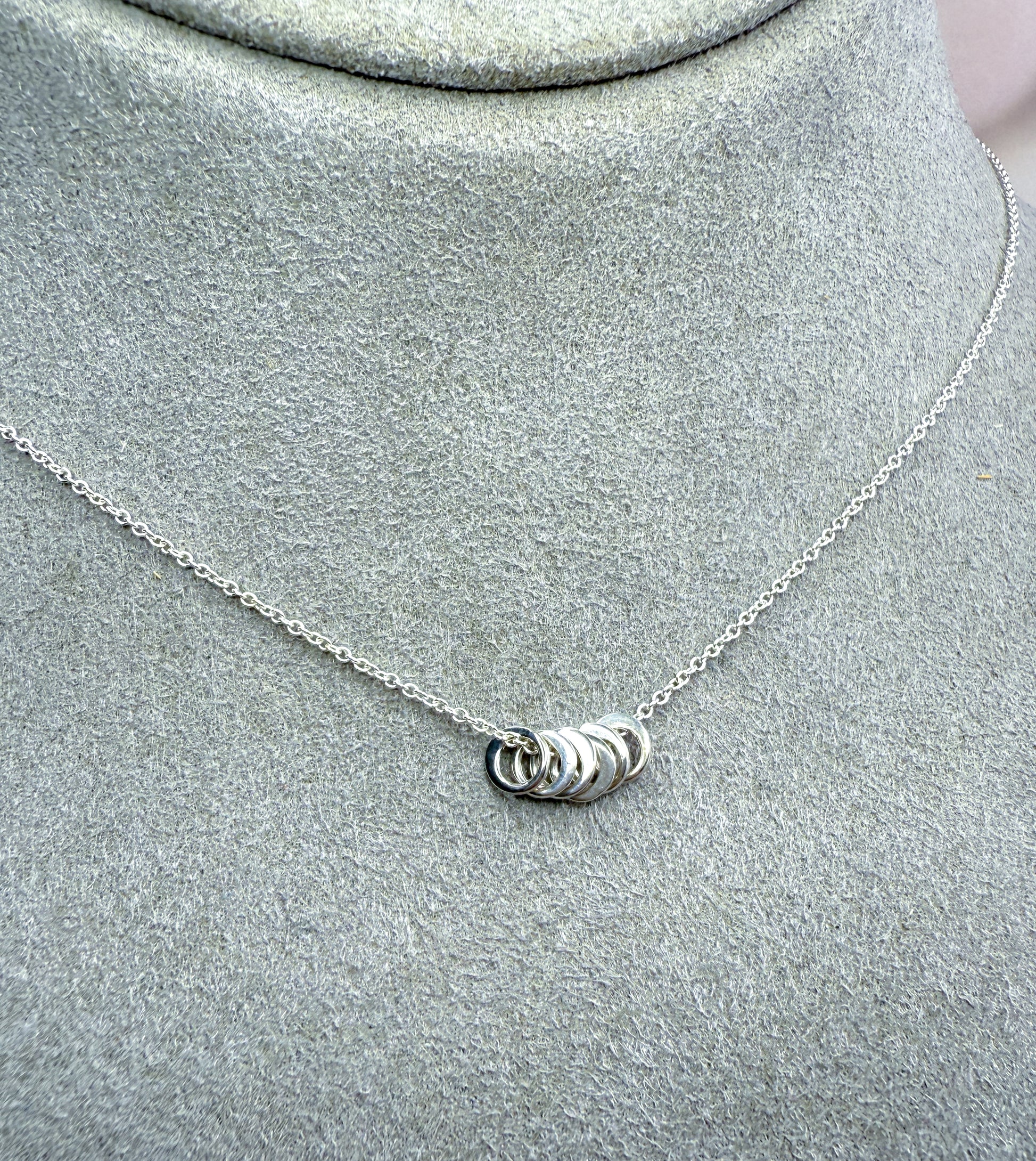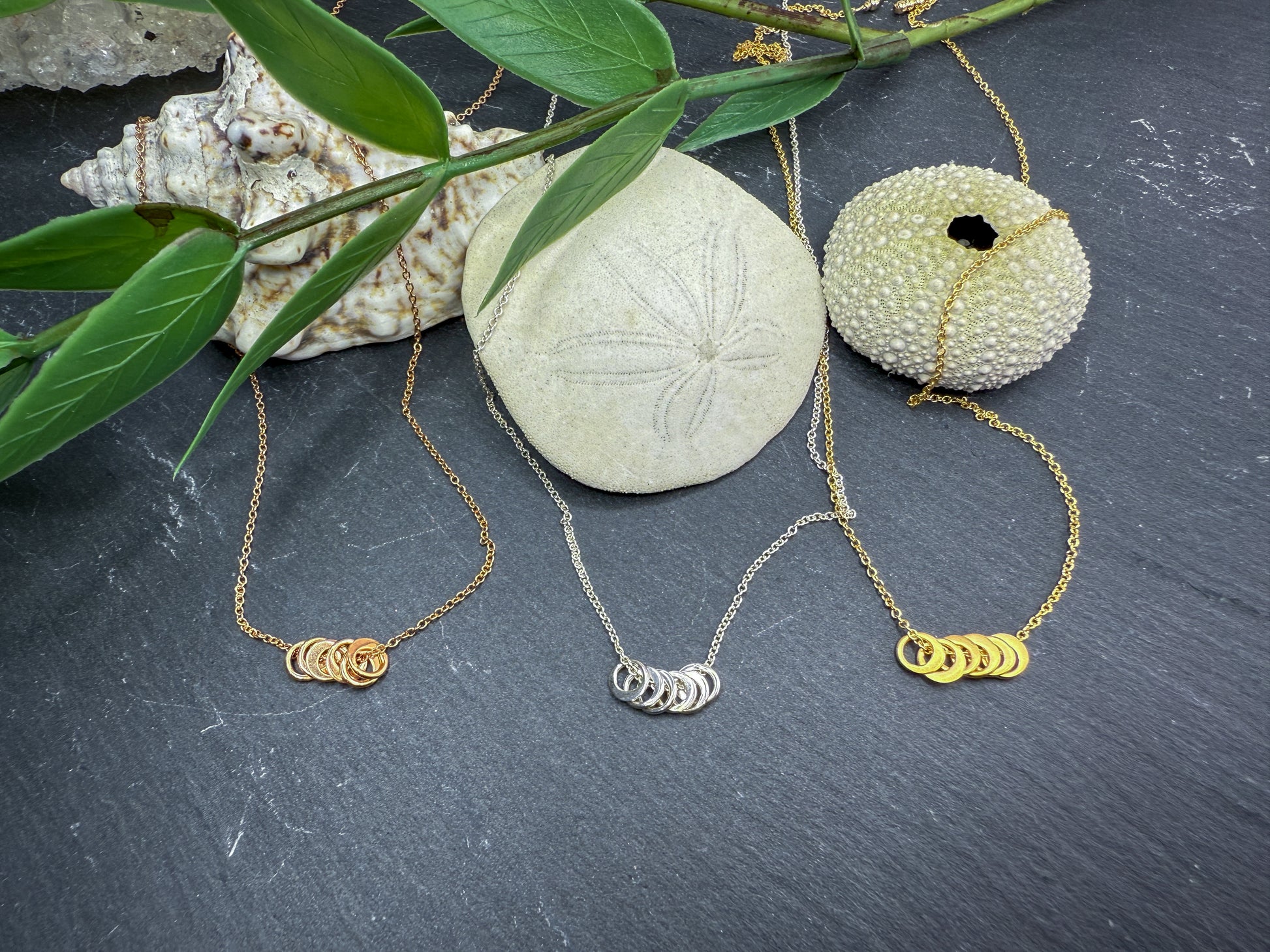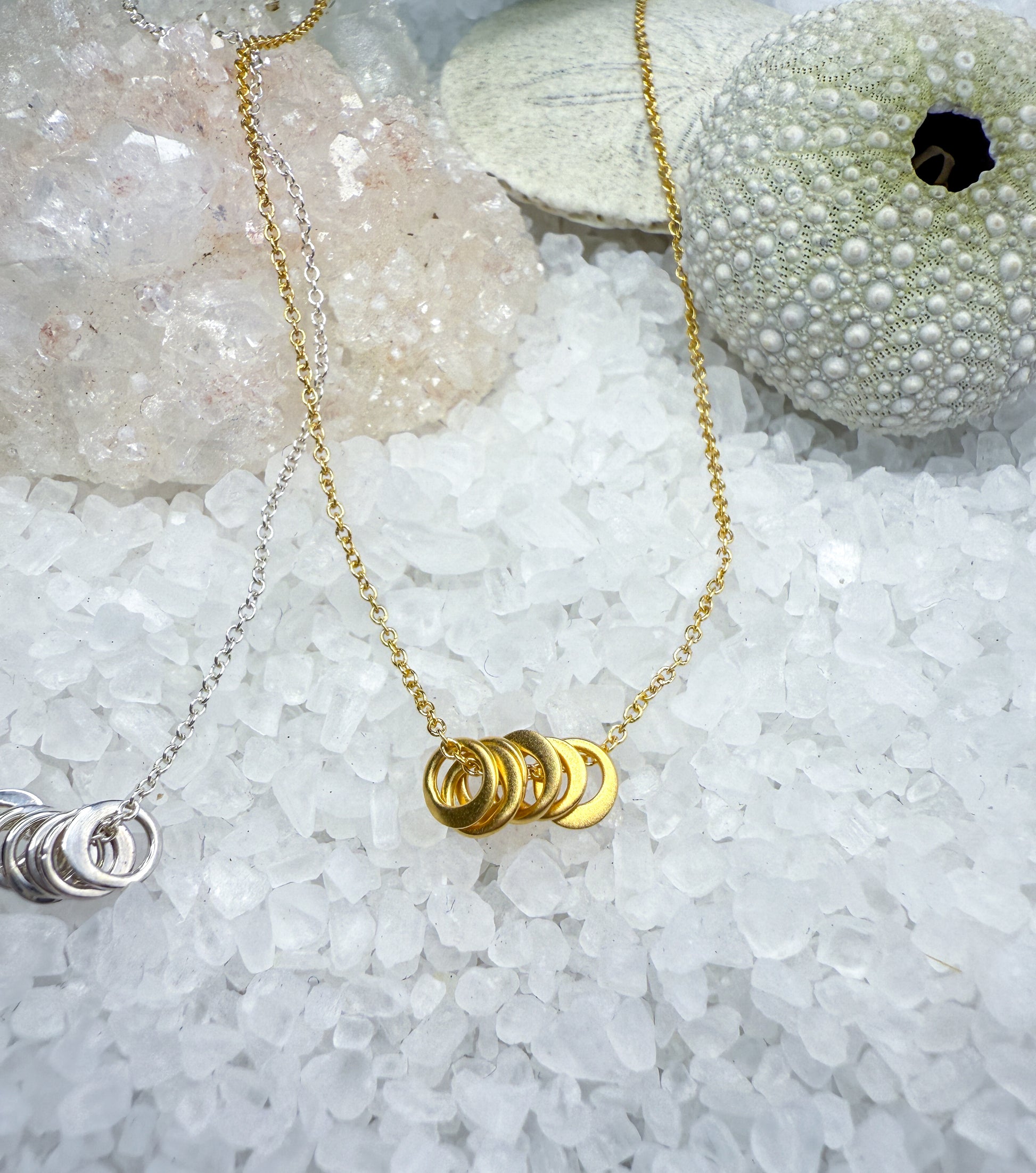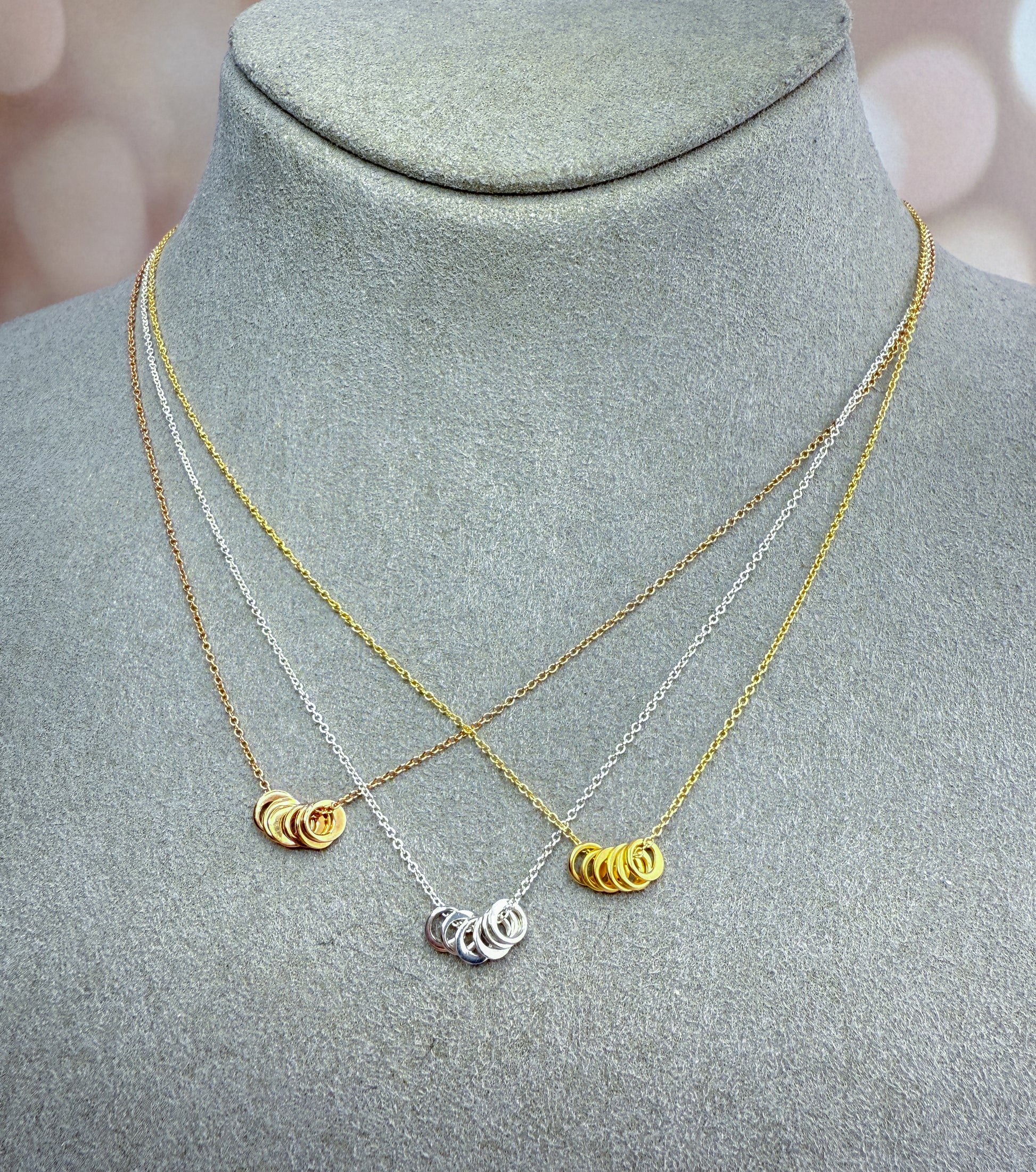 This delicate necklace features small 6mm rings that glide smoothly along a fine cable chain, adding subtle movement and shine.