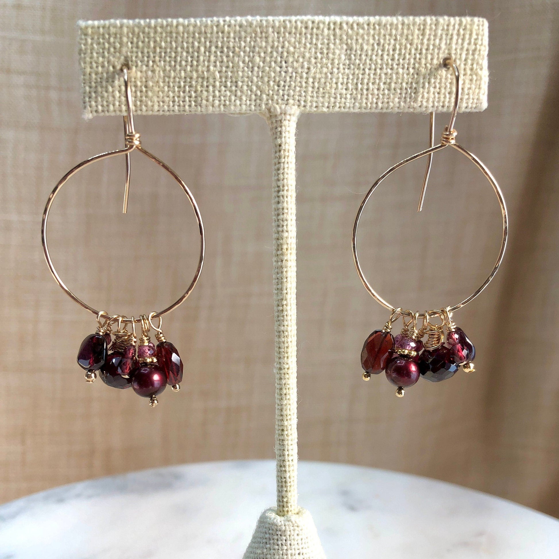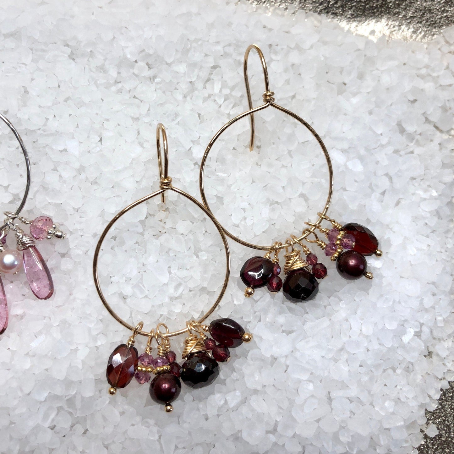 Beautiful shapes, sizes and finishes of garnets adorn these fun hoops. There are faceted oval garnets, candy kiss shaped garnets, rhodolite garnets, smooth garnets, and cranberry freshwater pearls... all hand wrapped to the oval gold filled hoops. The hoops are also hammered for a beautiful sparkly finish.