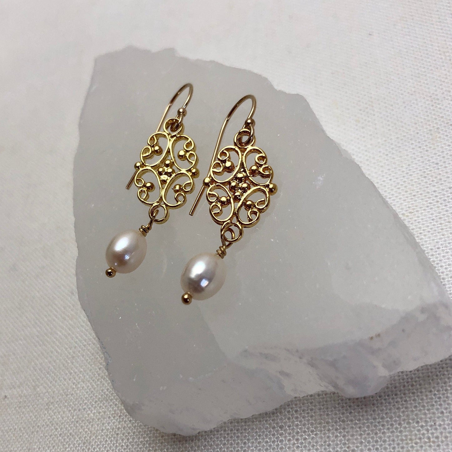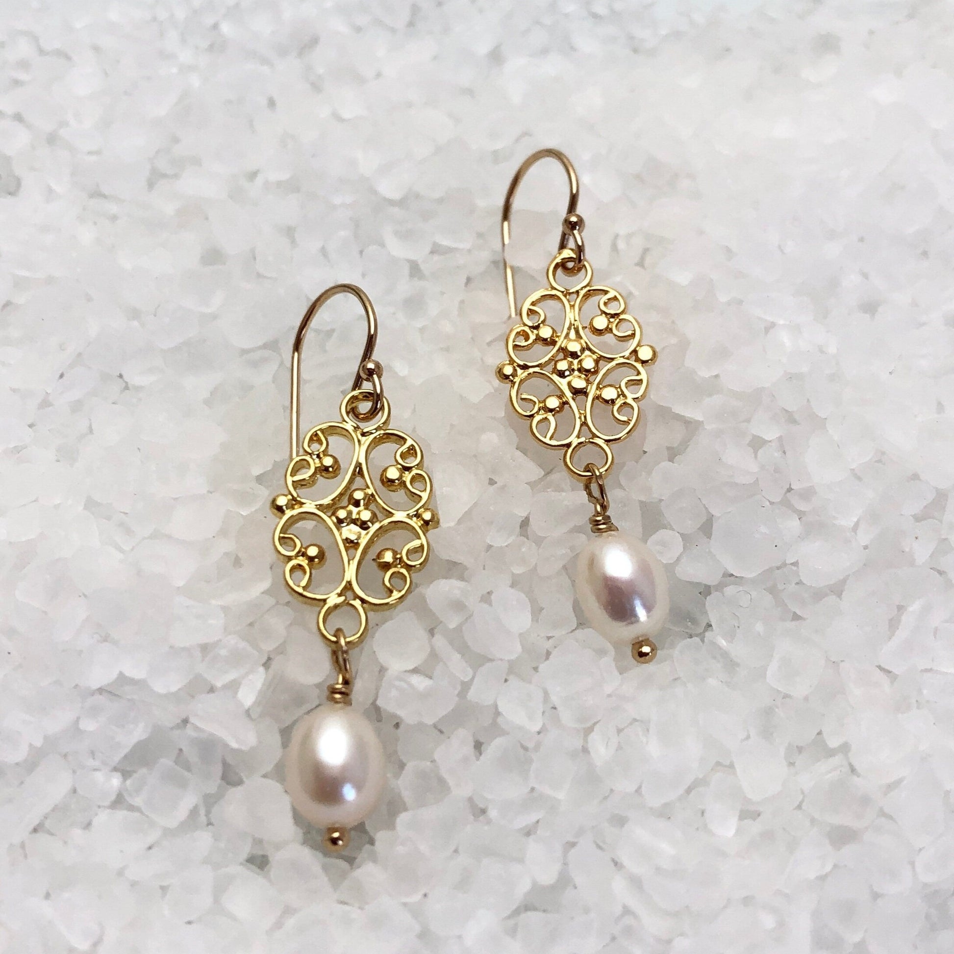 - Gold Filigree charms accented with 6mm rice pearls, on gold filled ear wires.