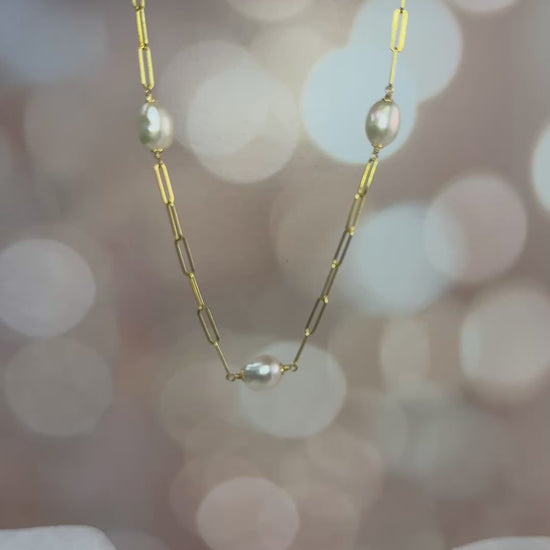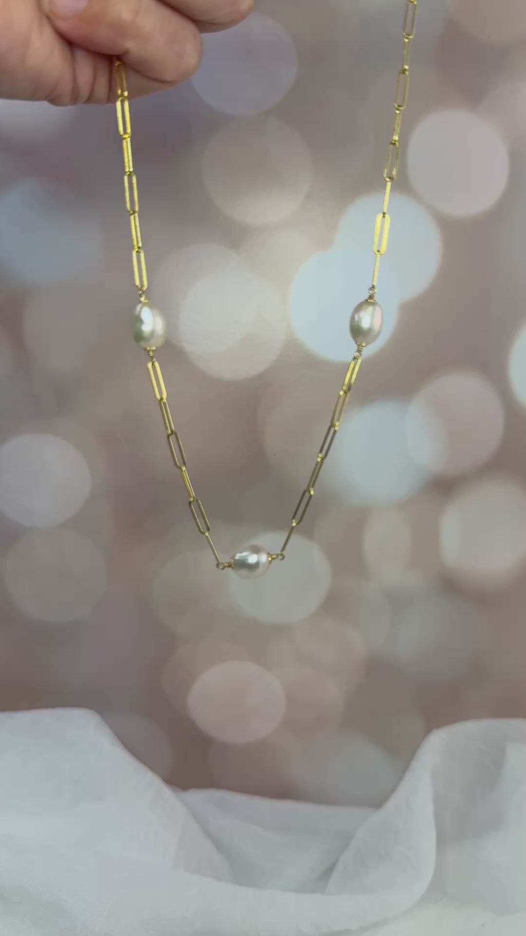A modern twist on classic pearl jewelry, this white freshwater pearl set blends timeless elegance with a fresh, contemporary feel. The necklace features three luminous freshwater pearls, each capped with delicate gold-filled floral bead caps, stationed along a thicker gold-filled paperclip chain for a slightly bolder look.